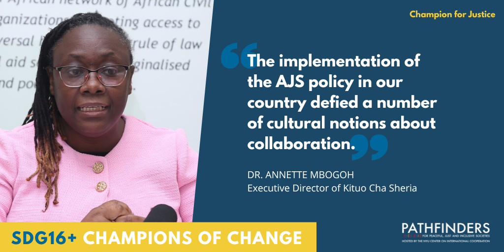 Annette Mbogoh: We have very beautiful policies and laws [surrounding AJS], but I think the challenge comes with implementation. We have the Constitution, the Legal Aid Act, and the AJS policy, but we want to see these implemented. And I think the only way we as civil society can convince the government is through having reliable data that can help them see things from another perspective. We need to show the government that funding justice is cheaper than funding health or funding education and that justice is the foundation of the socioeconomic growth of the country.
