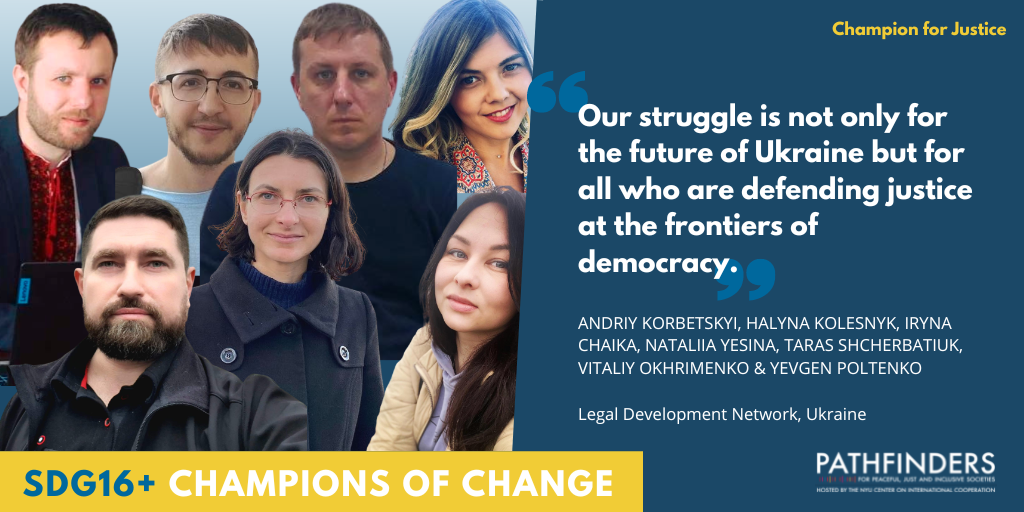 In the latest of our Justice Champions of Change series, Maaike de Langen and Themba Mahleka of the Pathfinders for Peaceful, Just and Inclusive Societies spoke with LDN members Andriy Korbetskyi, Halyna Kolesnyk, Iryna Chaika, Nataliia Yesina, Taras Shcherbatiuk, Vitaliy Okhrimenko, and Yevgen Poltenko to find out how they are coping, what innovations they have made, and what gives them hope in such a difficult situation.
